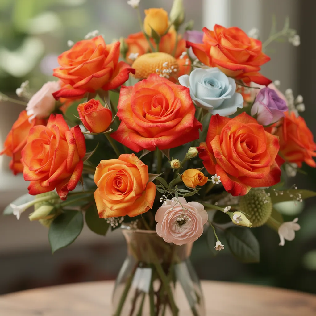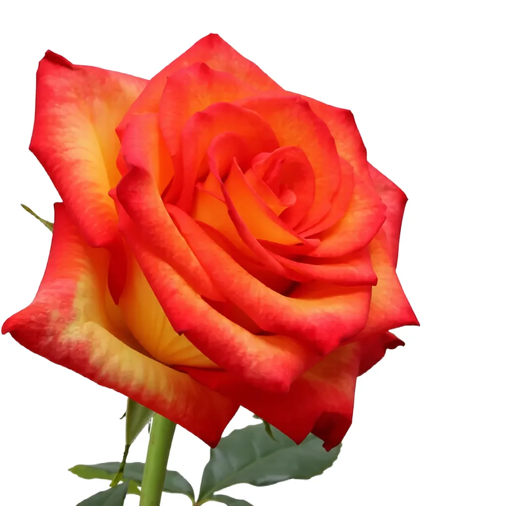 Rosa de color raranja vibrante con bordes rojizos, con un contraste llamativo y una forma elegante. Se distingue por su excelente apertura, buena duración en florero y gran impacto visual, ideal para arreglos modernos y exportación de alta calidad.